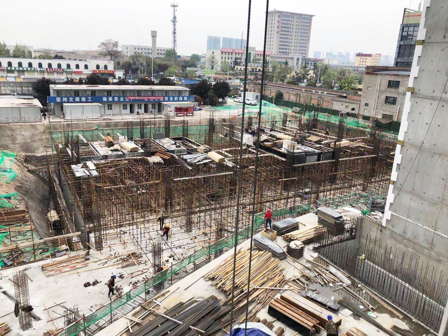 4#樓:地下室負(fù)一層框架柱鋼筋綁扎及部分頂板模板支設(shè)正在施工。