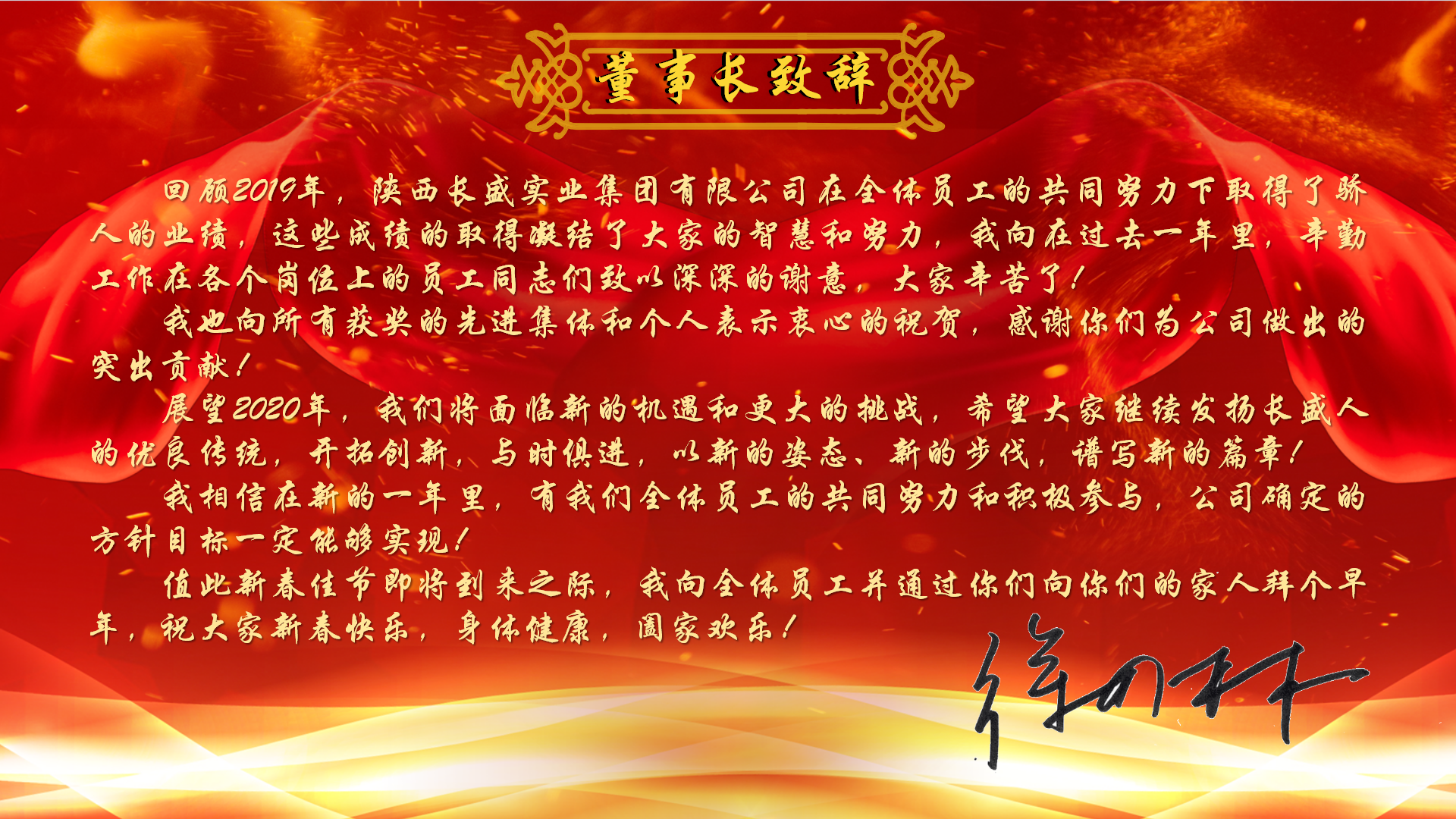 六、新年寄語2019年,長盛有許多的努力與感動,2020年,長盛集團有更多的期望與夢想,唯有奮斗,方知幸福滋味,新的一年讓我們全力以赴去開啟新的希望,用激情、擔當、奉獻、去創(chuàng)造長盛更大的輝煌!長盛感恩有你,2020年,我們在一起,再出發(fā)!